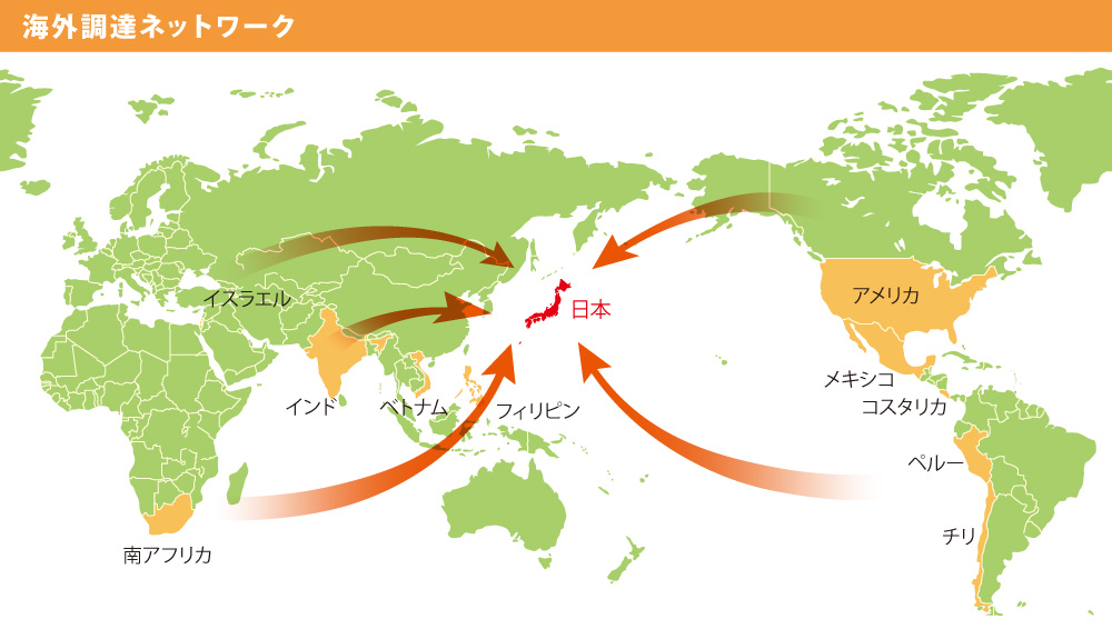1970年代より長年にわたり密接に関係を築いてきた世界各地のパートナーと連携し、高品質の原料(IQF、果汁、ピューレなど)を共同開発し、直接貿易により安定的に、かつタイムリーに調達を行っています。